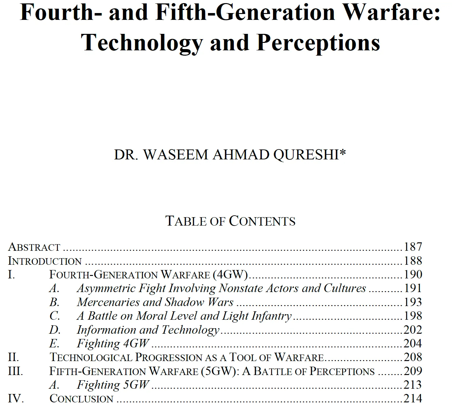 Je suis un étudiant, pas un expert de la 5GW, mais je me forme rapidement à l'école des coups durs. Par conséquent, pour essayer de donner un sens à cette nouvelle forme de guerre, j'ai dû m'appuyer sur de vrais experts. Dans cet esprit, veuillez pardonner la longue citation suivante tirée de « Guerre de quatrième et cinquième génération : technologie et perceptions », publiée en 2019 par le Dr Waseem Ahmad Qureshi. Avocat à la Cour suprême du Pakistan, dans le San Diego International Law Journal (Volume 21). L'article hautement référencé et noté en bas de page du Dr Qureshi peut être téléchargé gratuitement (PDF en anglais. NDT) ici. Pour ceux qui recherchent des informations et un contexte supplémentaires, je recommande également de lire "The Handbook of 5GW: A Fifth Generation of War?" par Daniel Abbott.